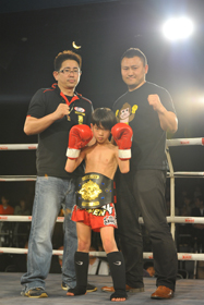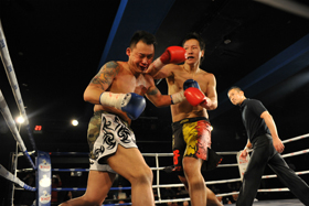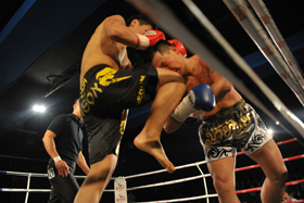 オーソドックスのバイソンに対し、サウスポーのバンビ。ゴングと同時に激しいパンチの打ち合いがなされ、序盤からバイソン・バンビ陣営の応援が加熱し、場内がヒートアップしていく。バイソンはジャブを突きながら右ストレート、首相撲からヒザ。パンチで応戦するバンビは、中盤に打ち合いを仕掛け、バイソンがこれに付き合い、パンチの打ち合いがなされていく。この中で放ったバイソンの右ストレートがバンビの顔面をとらえ、ダウンを奪う。