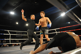 右ストレートとミドルを打つ学武は、ジリジリと距離を詰め、ガードが空いたATSUMUのレバーに学武の強烈なミドル!モロに入り、悶絶しながら倒れこむATSUMU。カウントが進むも、立ち上がることができず、学武がミドル一撃でKOするという衝撃的な勝利を収めた。