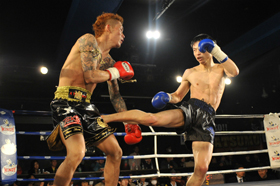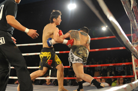 天承山が前蹴りを打ち、野尻の腹に突き刺していく光景が目立つ。野尻は天承山の前蹴りに左右フックを合わせるが、ことごとく空を切っていく。距離を取りながら、天承山が前蹴りと右ミドルを打ち続けていくうちに、野尻の腹が赤く晴れ上がっていく。